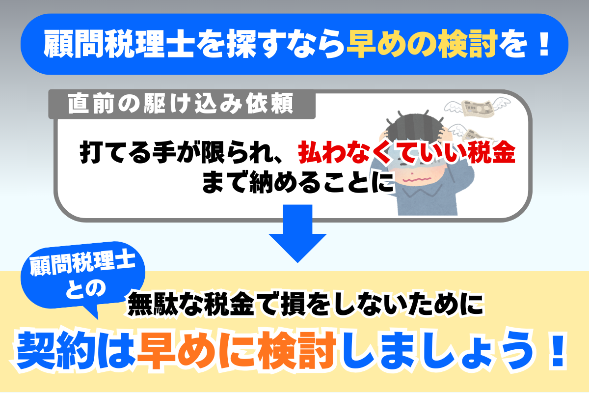 直前の駆け込み依頼では打てる手が限られ、本来払わなくて済むはずの税金まで納めることになりかねません。